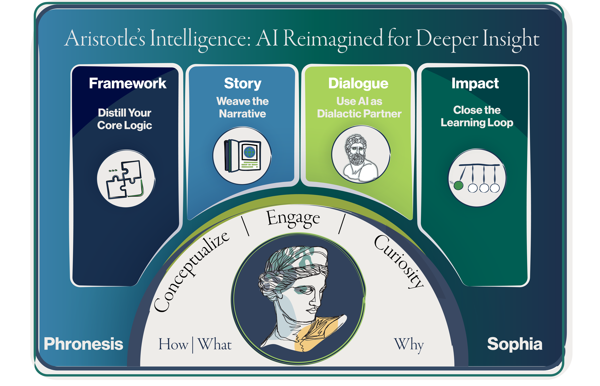 Aristotle's Intelligence: AI Reimagined for Deeper Insight. This model outlines the four pillars—Framework, Story, Dialogue, and Measurement—essential for cultivating wisdom and strategic judgment through AI-powered conversation.